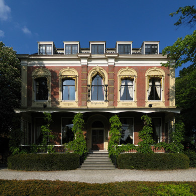 Inleiding DUBBELE VILLA, vrijstaand gesitueerd op de hoek van het smalle Hilghepad en de Verlengde Hereweg met rondom een parkachtige tuin, deel uitmakend van een reeks villa's grotendeels met rieten kappen aan de oostzijde van de Verlengde Hereweg, gebouwd in 1926 naar ontwerp van de Groninger a