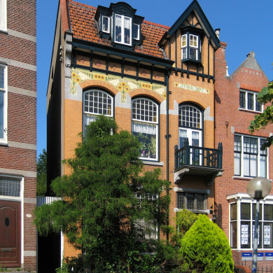 Inleiding WOONHUIS, gesitueerd in de nagenoeg gesloten westwand van de Verlengde Hereweg, bestaande uit bebouwing van rond de eeuwwisseling, gebouwd in 1907 in opdracht van levensverzekeringsmaatschappij 'Het Noorden' naar ontwerp van de Groninger architect G. Nijhuis in Overgangsarchitectuur met Art Nouveau-elementen. Het gebouw is thans nog in gebruik als woonhuis. In 1927 is het gebouw gesplitst in een afzonderlijke beneden- en bovenwoning en daartoe inwendig aangepast. De hal met glazen tochtdeur verkeert nog in de oorspronkelijke staat. De voortuin wordt omzoomd door een eenvoudig smeedijzeren hek uit de bouwtijd. De zijgevels zijn grijsgestuct en van ondergeschikt belang.De aanbouw aan de achterzijde valt buiten de bescherming. Omschrijving Het op een rechthoekige plattegrond opgetrokken gebouw telt twee bouwlagen en een zolderverdieping onder een afgeknot zadeldak, belegd met een rode kruispan. In het voordakschild een karakteristieke vierdelige houten dakkapel met gebogen fronton. De drie traveeën brede voorgevel heeft een hardstenen plint en is opgetrokken uit oranjekleurige verblendsteen. De iets risalerende ingangstravee heeft een topgevel met houten vakwerk waarin een driedelig erkertje. De regenpijp heeft ankers in de vorm van bladmotieven. In de ingangstravee een bewerkte houten toegangsdeur met geslepen glas, hardstenen kalf, latei en vierdelig bovenlicht en een hardstenen stoep tussen bakstenen muurtjes. Boven de deur een hardstenen balkon op twee bewerkte hardstenen consoles met houten balkonhek. De vensters op de begane grond zijn rechtgesloten onder natuurstenen lateien en hebben bovenlichten met een verfijnde roedeverdeling en geel glas. Boven de segmentboogvormige verdiepingsvensters een doorlopend fries van kleurige tegeltableau's in Art Nouveau-stijl met gestileerde bloemmotieven in geel en groen. In het ingangstravee op de verdieping een rechthoekig tegeltableau met het jaartal 1907. Boven de serre aan de achterzijde is een balkon met gemetselde open balustrade. De voortuin wordt omzoomd door een eenvoudig smeedijzeren hek. Waardering Woonhuis, opgetrokken in Overgangsarchitectuur met Art Nouveau-elementen naar ontwerp van de Groninger architect G. Nijhuis, van algemeen belang vanwege zijn cultuurhistorische en architectuurhistorische waarde, zijn gaafheid en vanwege de stilistische kwaliteit van de tegeldecoraties in Art Nouveau-stijl in de voorgevel.