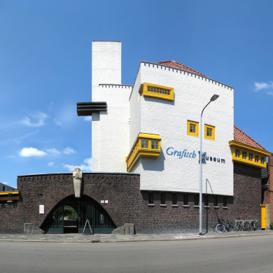 Inleiding SCHOOLGEBOUW, vrijstaand gesitueerd op de hoek van de Rabenhauptstraat en de Achterweg, gebouwd als zes-klassige openbare lagere school in 1928-1929 in opdracht van de gemeente naar ontwerp van de Groninger architect S.J. Bouma (Gemeentewerken) in de stijl van het kubistisch expressionisme. De gebeeldhouwde sluitsteen boven de ingangspoort is van de hand van de Groningse beeldhouwer Willem Valk. Het terrein wordt afgesloten door een manshoge muur, waarin een poort is opgenomen. Sinds 1989-1990 is het gebouw in gebruik als grafisch museum en daartoe gedeeltelijk aangepast. Tijdens de renovatie is de huidige, gele kleurstelling aangebracht. Omschrijving Het gebouw is opgetrokken op een rechthoekige plattegrond en telt twee bouwlagen onder een schilddak, dat belegd is met een rode verbeterde Hollandse pan. De baksteengevels van het gebouw zijn gesausd in een gelige tint (oorspronkelijk witgesausd), behalve de gevel van de begane grond, die is opgetrokken uit bruine, ruwe mondsteen. De westgevel heeft twee brede vensterstroken met houten kozijnen, betonnen lateien, penanten en dorpels. De bovenlichten hebben 16 ruits-roedeverdelingen. De zuidgevel heeft een aan de straatzijde omlopende vensterstrook. Tegen de westgevel is een torenachtige schoorsteen geplaatst, waarvan de enige versiering bestaat uit drie, deels uitstekende horizontale, betonnen platen. De kubische zuidgevel met het trappenhuis wordt slechts verlevendigd door uit het lood geplaatste hoekraampjes met geometrisch glas-in-lood en een asymmetrisch geplaatst venster op de verdieping. De amper zichtbare oostgevel, die via een smalle gang van de aangrenzende bebouwing wordt gescheiden, heeft regelmatig geplaatste vensterstroken met een roedeverdeling. Het schoolterrein wordt omringd door een manshoge muur van bruine mondsteen, die een volwaardig onderdeel van het ontwerp vormt en waarin aan de zuidzijde een poort met een overdekte schuilplaats is opgenomen. De poort heeft een parabolische boog met op de sluitsteen een gebeeldhouwde pelikaan en een fraai bewerkt, smeedijzeren hek. Inwendig ondermeer van belang de hal met betegeld trappenhuis en kleurige glas-in-lood vensters. Waardering Schoolgebouw met bijbehorende ommuring en poort, vormgegeven in een fraaie op de architectuur van Dudok geïnspireerde bouwstijl, van algemeen belang vanwege zijn cultuurhistorische en architectuurhistorische waarde als representant van de expressionistische architectuur van de jaren twintig, vanwege zijn belang voor het oeuvre van architect S.J. Bouma en vanwege de architectonische gaafheid van het exterieur.