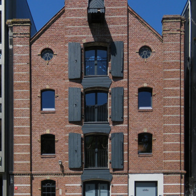 Inleiding PAKHUIS, met het aangrenzende pakhuis op nr. 44 gesitueerd aan de Aweg en het Hoendiep, gebouwd in 1912 als korenpakhuis in opdracht van J. van der Veen en M. Dijkstra naar ontwerp van de Groninger architecten K.H. en T. Holthuis in een ambachtelijk-traditionele bouwstijl.