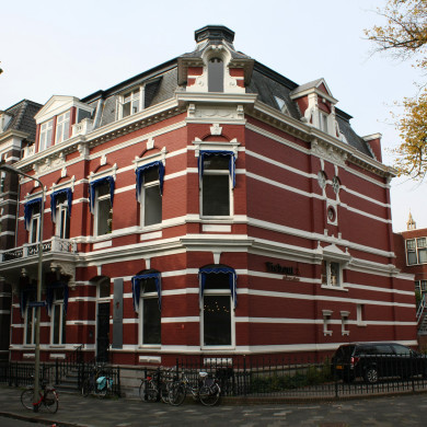 Inleiding HERENHUIS, gesitueerd in de gesloten, uit eind negentiende-eeuwse herenhuizen bestaande noordelijke gevelwand van de Praediniussingel, gebouwd in 1896 in opdracht van de Groninger aannemer/architect P. Belgraver naar eigen ontwerp in een eclectische bouwstijl.