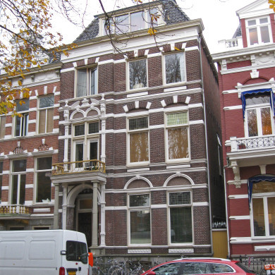 Inleiding HERENHUIS, gesitueerd in de gesloten, uit eind negentiende-eeuwse herenhuizen bestaande noordelijke gevelwand van de Praediniussingel, gebouwd in 1896 in opdracht van de Groninger aannemer/architect P. Belgraver naar eigen ontwerp in een eclectische bouwstijl.
