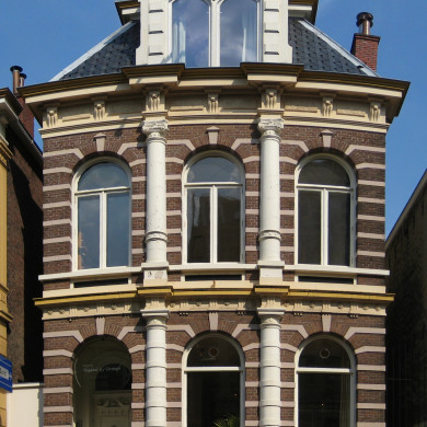 Inleiding HERENHUIS, deel uitmakend van de eind negentiende-eeuwse, nagenoeg gesloten westelijke gevelwand van de Stationsstraat, bestaande uit representatieve herenhuizen, van de aangrenzende panden gescheiden door smalle gangen, gebouwd in 1882 als hotel naar ontwerp van de uit Leeuwarden afkom