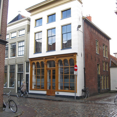 Inleiding WOONHUIS MET JONGERE WINKELPUI, gesitueerd in de gesloten zuidelijke gevelwand van de Turftorenstraat op de hoek met de smalle Lutkenieuwstraat, van oorsprong zeventiende eeuws, rond 1850 voorzien van een sobere, monumentale lijstgevel met winkelpui in een eclectische bouwstijl. Het gebouw is thans in gebruik als woonhuis. Omschrijving Het gebouw is opgetrokken op een in hoofdvorm rechthoekige plattegrond en telt twee bouwlagen en een mezzanine-verdieping onder een schilddak, belegd met een golfpan. De voorgevel is drie raamtraveeën breed en bevat op de begane grond over de volle breedte een houten winkelpui. De pui is symmetrisch van opzet en bestaat uit een pilasterstelling die deur en ramen omvat. Het geheel wordt afgesloten door een geprofileerde lijst. De consoles zijn voorzien van diamantkoppen en velden met een wafelmotief. De driedelige winkelvensters op de gestucte plint zijn voorzien van geprofileerde roeden die aan de bovenzijde uitlopen tot een golfvormige verbreding, die een vrij forse driedelige rondboogsluiting met geprofileerd lijstwerk dragen. De dubbele deur bezit een bovenlicht met afgeronde hoeken. De rest van de gevel is vlak gepleisterd en voorzien van schijnvoegen. Op de verdieping zijn grote zes-ruitsvensters aangebracht en onder de geprofileerde kroonlijst met bakgoot, die het voordakschild nagenoeg aan het oog onttrekt, bevindt zich een mezzanine-verdieping, die drie liggende vensters bezit. Voorhuis en achterhuis vormen een winkelpand dat vermoedelijk uit het begin van de zeventiende eeuw dateert. Het voorhuis bezit op de begane grond een hoge ruimte en daarboven een verdieping. Het achterhuis bezit een lage binnenhaard, een nog meer gedrukte insteek en een verdieping. Deze ruimtelijke geleding is zichtbaar in de zijgevel aan de Lutkenieuwstraat; zowel aan de vensters als aan de muurankers. De deur in de zijgevel met hoog bovenlicht is vermoedelijk in de achttiende eeuw aangebracht. Inwendig nog van belang de oorspronkelijke houten winkelbetimmering langs de wanden met spitsbogen in neo-gotische stijl. Waardering Woonhuis, van zeventiende eeuwse oorsprong met een monumentale, negentiende-eeuwse gepleisterde lijstgevel, van algemeen belang vanwege zijn cultuurhistorische en architectuurhistorische waarde als representant van de zeventiende-eeuwse woonhuisarchitectuur met binnenhaard en insteek, alsmede vanwege de bijzonder vormgegegeven winkelpui in eclectische bouwstijl, zijn gaafheid en zijn betekenis als onderdeel van de stedebouwkundig waardevolle structuur van beeldbepalende panden in de Turftorenstraat. Bovendien is gebouw van buitengewoon belang vanwege de typologische zeldzaamheid.