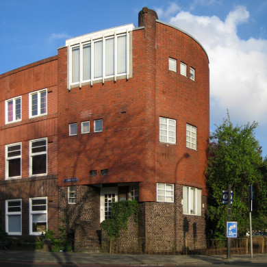 Inleiding WOONHUIS, gesitueerd op de hoek van de gesloten zuidelijke gevelwand van de W.A. Scholtenstraat en de Turfsingel, gebouwd in 1923 als eigen woonhuis en kantoor naar ontwerp van de Groninger architect E. van Linge in de stijl van de Amsterdamse School. Het gebouw is thans in gebruik als woonhuis met kantoor.Het van oorsprong rijk aangeklede interieur in de stijl van de Amsterdamse School is aangepast. Omschrijving Het markante gebouw is opgetrokken op een in hoofdvorm vierkante plattegrond en telt drie bouwlagen onder een plat dak. De westelijke gevel aan de Turfsingel is naar het noorden toe rondgezet. Aan de W.A. Scholtenstraat bevindt zicht een toegangstrap naar de portiek. De trap en de gevel van de begane grond zijn opgetrokken uit een bijzonder onregelmatig gevormde gesinterde mondsteen en zijn gemetseld in wildverband. Op de begane grond zijn drie raamopeningen gemaakt met stalen kozijnen. De gevel van de verdieping is opgetrokken uit een donkerrode perssteen. Op de hoek bevindt zich een halfrond uitgemetseld rookkanaal. Het gevelvlak wordt geopend door een reeks van gepaarde, qua afmeting en vorm wisselende vensters met stalen kozijnen. De gevel aan de W.A. Scholtenstraat wordt afgesloten door een groot uit het gevelvlak springend venster. De van oorsprong harmonica-achtige stalen roeden zijn vervangen door kunststofkozijnen. In de westelijke gevel bevindt zich nog een oorspronkelijk venster met gekleurd glas-in-lood in de stijl van 'De Ploeg'. De daklijn maakt verschillende sprongen. De gevel is geheel begroeid met een klimplant. De indeling van de achtergevel is oorspronkelijk en bevat op de begane grond een terras met een bakstenen ommuring van kromme klinkers met een trapje naar de tuin. Waardering Woonhuis, van algemeen belang vanwege zijn cultuurhistorische en architectuurhistorische waarde als uitermate waardevolle representant van de bouwstijl van de Amsterdamse School, waarvan dit gebouw het vroegste exemplaar in de stad Groningen is. Bovendien is het gebouw van betekenis voor het oeuvre van architect E. van Linge. Daarnaast maakt de plastische vormgeving het gebouw tot een belangrijk element in de stedebouwkundige situatie van de W.A. Scholtenstraat en omgeving in de stad Groningen.