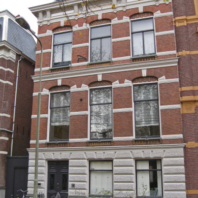 Inleiding HERENHUIS, met aan weerszijden een smalle steeg, gesitueerd in de gesloten, noordelijke gevelwand van de Ubbo Emmiussingel, gebouwd in in 1888 naar ontwerp van de Groninger architecten K. en H. Hoekzema in een rijk versierde, eclectische bouwstijl.
