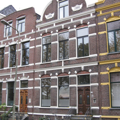 Inleiding HERENHUIS, gesitueerd in de gesloten, uit eind negentiende-eeuwse herenhuizen bestaande noordelijke gevelwand van de Praediniussingel, deel uitmakend van een symmetrisch opgezet ensemble van drie aaneengeschakelde herenhuizen, gebouwd in 1896 in opdracht van de gebroeders Th. en P.