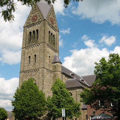 In een Neo-Romaanse stijl in 1924 naar een ontwerp van architect Caspar Franssen uit Roermond gebouwde KATHOLIEKE KERK ter ere van Sint Petrus.