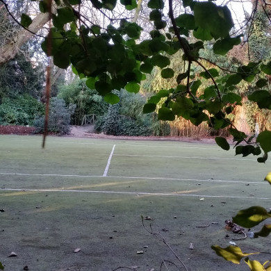 In de royale stadstuin van villa Betty gesitueerde VOETBRUG over de kleine tuinvijver met terzijde een imitatie-boomstronk, beide uitgevoerd in kunststeen en daterend uit het laatste kwart van de negentiende eeuw en deel uitmakend van het villa Betty-complex.