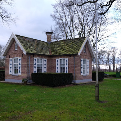 PORTIERSWONING. Laat 19e eeuwse, rode bakstenen portierswoning op kruisvormige plattegrond onder vier met grijze Oudhollandse pannen gedekte zadeldaken (met op elk schild een kruis van rode pannen), gelegen ten westen van de oprijlaan naast het hoofdinrijhek aan de Berkenallee. Op het punt waar de daken samenkomen een vierkante bakstenen schoorsteen. De gevels van de woning, die door gele bakstenen strekken zijn opgesierd, zijn op de begane grond voorzien van meerruits-schuifvensters met hardstenen kozijnen en luiken. De vier kopgevels, die op de windrichtingen georienteerd zijn, vertonen op de verdieping een klein halfrond venster, waarvan de roeden aan de bovenzijde in een gotische tracering, bestaande uit twee spitsbogen en een vierpas, samenkomen. De kopgevels zijn verder voorzien van een versierde houten windveer met een makelaar. De naar de oprijlaan gerichte oostgevel heeft in de linkergevel rechts naast het venster een korfboogvormige toegangsdeur. De westgevel heeft in de rechterzijmuur van de kopgevel rechts naast het venster een toegangsdeur met getoogd drie ruitsbovenlicht, waarvan de roeden schuin geplaatst zijn.