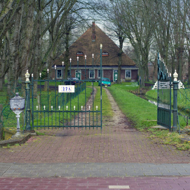 Stolphoeve met koehuisstraat. Houten middentop boven de voorgevel. Negenruitsschuifvensters. Opkamertje. XVIII. Inwendig: tegeltableau.