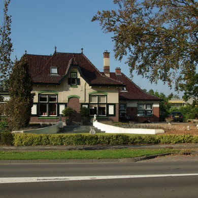 Het vm. woonhuis bestaat uit twee bouwvolumes van één bouwlaag op L-vormig grondplan. Het woonhuis op bijna vierkante grondslag bestaat uit een onderbouw van bruine bakstenen, het muurvlak boven de groen geglazuurde cordonlijst bestaat uit crèmekleurige verblendstenen. Het pand heeft een overstekend geknikt afgeknot schilddak met keramische pironnen gedekt met bruin geglazuurde tuile-du-nord pannen en heeft een gootlijst op klampen. Een in bruine en gele stenen gemetselde hoge schoorsteen in het oostelijk zijschild. In de zuidgevel twee brede houten kruisvensters met luiken voor de onderste ruiten en groen geglazuurde lekdorpels. Boven de vensters zijn geel-groen geglazuurde segmentbogen met Jugendstil-decoratie in de boogtrommels. Tussen de twee vensters wordt de cordonlijst onderbroken en lijkt een opgetrokken segmentboog met een groen geglazuurde segmentboog in het muurvlak een denkbeeldige entree te bekronen. In het risaliet topgeveltje is een smal verticaal venster met luiken. Uitkragende muurdammen vormen de aanzet voor een risalerend muurvlak, verlevendigd met sterankers en opgetrokken tot een kajuit. Onder een afgewolfd geknikt zadeldakje met een zinken piron. Aan de oost- en westgevel worden alle H-, en kruisvensters met luiken eveneens afgesloten door een geglazuurde segmentboog met gedecoreerde boogtrommels. Aan de westgevel bevindt zich, direct naast de grote driezijdige serre met plat dak, een houten deur met boven- en zijlicht. Daarboven is een grote kajuit onder afgewolfd geknikt zadeldak. Balkondeuren met bovenlicht onder strek en luiken bevinden zich naast de serre en in de kajuit.