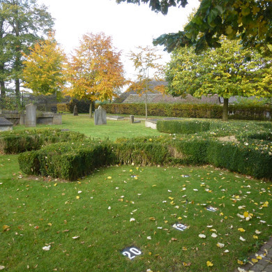 LANGGEVELBOERDERIJ met dwarsdeel gebouwd in ambachtelijk-traditionele stijl in de tweede helft van de 19de eeuw. Rechthoekige plattegrond met de lange gevel aan het Kerkhof. Erf met boerenhof en hoogstamboomgaard, gedeeltelijk omzoomd door beukenhaag.