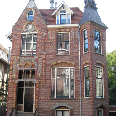 Verder vier decoratieve tegeltableaux en uit gele en rode baksteen samengesteld decoratief metselwerk in horizontale en verticale banden. Dakkapel met houtwerk en hijsbalk.