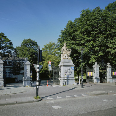 In neo-renaissance uitgevoerde TOEGANGSHEK als hoofdingang van het Vondelpark, gelegen aan de Stadhouderskade naar een ontwerp uit 1883 ten behoeve van de Wereldtentoonstelling te Amsterdam van de Duitse architect A. Linnemann bestaande uit een over de gehele breedte van het park uitlopend smeedijzeren hekwerk op een hardstenen plint tussen eveneens hardstenen hekpijlers waarvan sommige zijn voorzien van een bolvormige bekroning. De ingangspartij bestaat uit twee brede ingangen met smeedijzeren toegangshekken voorzien van florale motieven, van elkaar gescheiden door een monumentaal beeldhouwwerk, voorstellende de Amsterdamse stedenmaagd, op een hardstenen sokkel. De sokkel is aan de voorzijde voorzien van reliëfwerk voorstellende het wapen van Amsterdam. De beide aan weerszijden van de dubbele hoofdingang gelegen zijingangen zijn geplaatst tussen bolvormig bekroonde hardstenen pijlers met aan de voorzijde reliëfwerk en voorzien van eveneens met florale motieven uitgevoerde smeedijzeren toegangshekken.