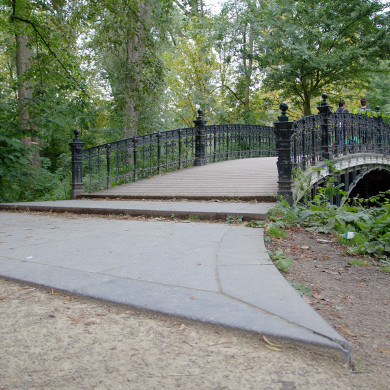 Brug nr. 450 over de zich versmallende waterpartij mid-oostelijk in het park, in het verlengde van de toegang aan de Vondelstraat en het wandelpad naar het Blauwe Theehuis. IJzeren vaste loopbrug op ijzeren constructie waarvan het dek voorzien is van houten delen. Sierijzeren balustraden waartussen ijzeren balusters.