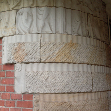 Tussen de vensters op de bovenverdieping hardstenen sierconsoles.