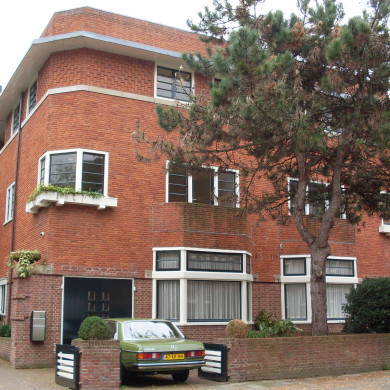 In rode baksteen opgetrokken dubbelvilla bestaande uit een kelderverdieping, een hoofdverdieping en twee verdere verdiepingen. Ontworpen op een samengesteld rechthoekig grondplan en uitgevoerd met in- en uitspringende kubische vormen. Het geheel wordt gedekt door een plat dak. De voorgevel toont links van een driezijdige erker op de hoofdverdieping een openslaande dubbele garagedeur. De inpandige garage was destijds gesitueerd naast de keuken en eetkamer. Boven de erker nog een balkon met dichtgemetselde borstwering. De vensters tonen de voorkeur voor de horizontale roedenverdeling. Deels afgeschuinde hoek met overhoeks geplaatst driedelig venster met roedenverdeling. Breed uitkragende lijst boven de tweede verdieping waaronder vierkante vensters waartussen baksteenvlakken met in trapmotief uitgewerkte decoratie. Boven de uitkragende lijst nog een blinde attiekzone.