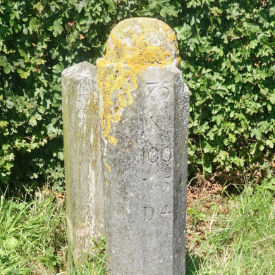 Hoefslagpaal nr. 75 is een van de laatste vijf, deze staat niet meer op de oorspronkelijke plaats, maar is na dijkverzwaring herplaatst, circa 25 meter ten oosten van het Veerhuis te Veecaten. Zeskantige arduinstenen paal gedekt met een halve bol. Inscriptie uit 1760: R 100 V 5 D 4. In 1764 zijn achterop nieuwe maten ingebeiteld: 75 R 94 V 8 D 3.