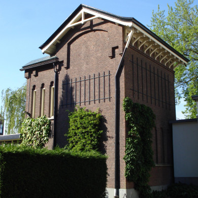 Van de achtergevel is het bouwdeel onder het zadeldak blind. In de aansluitende gevel onder het platte dak drie smalle hoge vensters, gedetailleerd zoals eerder omschreven. Geheel links springt circa een derde deel van het bouwdeel onder het platte dak terug van de rooilijn. Bovenin de zuidelijke gevelvlakken siermetselwerk.