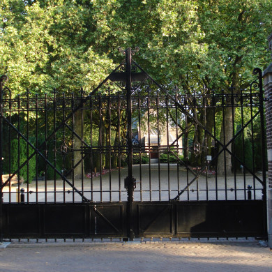 Het hekwerk tussen de poortgebouwen bestaat uit een grote smeedijzeren poort met aan weerszijden drie gemetselde pijlers van rode baksteen en natuursteen op een rustica basement. De pijlers hebben een gedecoreerde natuurstenen bekroning, waarvan die van de binnenste en buitenste pijlers het meest prominent zijn. Tussen de pijlers, boven het rustica basement, smeedijzeren hekwerken.