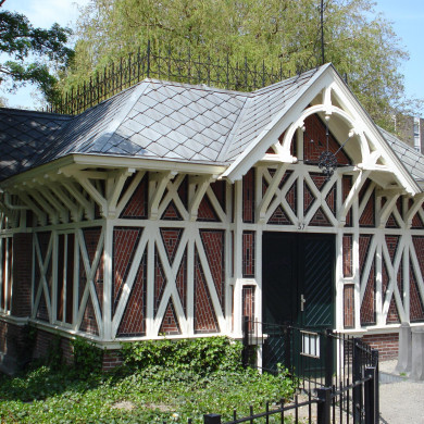 Het POMPGEBOUW annex VUILVISHUISJE gebouwd in 1890-91 in Chaletstijl naar ontwerp van W.A. Scholten en G.J de Jongh (directeur Gemeentewerken). Gelegen aan het zuid-oostelijk uiteinde van de Boezemsingel en oorspronkelijk behorend tot het Oostelijk stoomgemaal van Rose's Waterproject uit 1842.