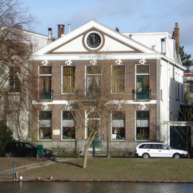 De hoeklisenen dragen een architraaf, waarop de naam van het huis 'Het oude slot' staat, en een fronton over de gehele breedte van de gevel. Het timpaan is gedeeltelijk wit gepleisterd met centraal hierin een grote ronde klok. Op de geveltop een voluutvormige decoratie.