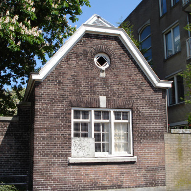 Aan de straatzijde heeft het gebouwtje een groot drieledig venster met kleine roedenverdeling. In de puntgevel van de verdieping bevindt zich een klein rond venster.