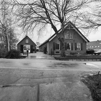 De linkerzijgevel (O) bevat van noord naar zuid: één keldervenster met houten luiken ter hoogte van de kaaskelder, twee houten T-schuifvensters met getoogde bovendorpels en houten luiken, één houten deur met glazen bovenlicht, twee ijzeren stalvensters, één houten deur en wederom twee ijzeren stalvensters.