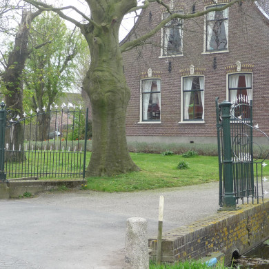 Gietijzeren TOEGANGSHEK, geplaatst op de dam over de wegsloot, gelegen op het meest noordelijke deel van het erf van het boerderijcomplex.
