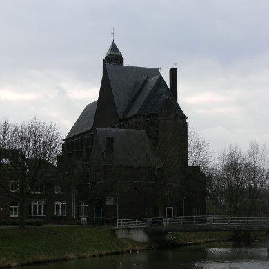 ST.HUBERTUSKERK, driebeukig met toren, waaronder een als patronaat ingerichte souterrainverdieping. Gesitueerd in de tussen Maas, Voedingskanaal en Zuid-Willemsvaart gesitueerde wijk Boschpoort. Gebouwd in expressionistisch stijl, in opdracht van bouwpastoor A. Lenders, naar een ontwerp van architect Jules Kayser, 1924-25. Het dak en de toren van de kerk werden respectievelijk in 1975 en 1977 gerestaureerd.
