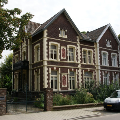De villa heeft een schuine hardstenen plint met souterrainvensters en geprofileerde lijst. Bakstenen optrek, gemetseld in kruisverband, met gesneden voegen. Geprofileerde venster- en deurlijsten in gesausde mergel. Doorlopende hardstenen dorpellijsten in de eerste bouwlaag. Dorpel- en gevellijsten van de tweede laag, alsmede aanzetstenen en teerlingkapitelen van traceringen in mergel.