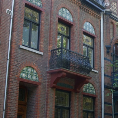 Rondboogvormige strekken. De vensters van de voorgevel hebben in de bovenlichten nog de oorspronkelijke glas-in-lood decoratie met geometrische motieven: in de ramen is het glas-in-lood van recente datum.