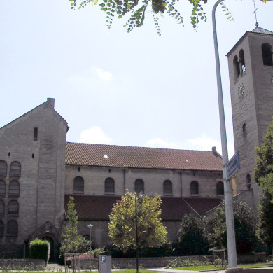 Kerkschip onder zadeldak, verzonken achter kopgevels. Zijbeuken en narthex onder lessenaarsdaken, verzonken achter kopgevels. Asymmetrische zadeldaken met schoorstenen op de transepten. Ronde absis met samengesteld dak. Kapel aan de zuidwestzijde en sacristie aan de zuidoostzijde voorzien van gewelfde tentdaken. Holle en bolle pannen.