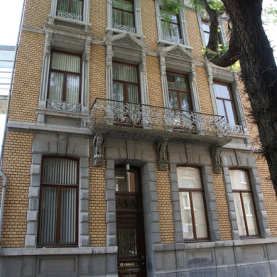 HUIS met brede lijstgevel, XVIIIc. Vensters in hardstenen segmentboogomlijsting, onderbroken verticale reliefbanden en een rijk gebeeldhouwde ingangsomlijsting in régence-stijl. Twee dakkapellen met fronton.