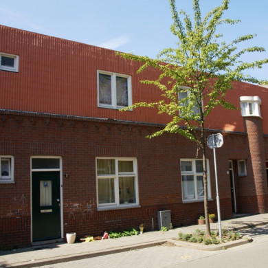ZEVEN ARBEIDERSWONINGEN, 1919, als geheel een aaneengesloten L-vormige straatwand. Gebouwd in opdracht van de socialistische Woningvereniging Beter Wonen, naar een ontwerp van de Amsterdamse architecten Z.Gulden en J.Geldmaker, in een door de Amsterdamse School beïnvloede bouwtrant. Deze panden werden in 1919 voorzien van een houten bergplaats en in 1993 gerenoveerd.