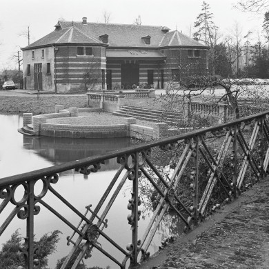 Tegen de westgevel staat een geel gesausde halfhoge muur met doorrij-openingen, die de zuidelijke oprijlaan flankeert en doorloopt tot de achtergevel van de portierswoning.