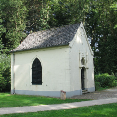 Omstreeks 1815-1830 in opdracht van A.C.W. Munter gebouwde neogotische bakstenen kapel, op rechthoekige grondslag en grijs geschilderde plint, roomwit geschilderd. De kapel heeft een met grijze pannen gedekt, licht inzalend zadeldak. De voorgevel is voorzien van een ingangspartij boven een hardstenen stoepje met twee treden, bestaande uit een dubbele, halfrond beëindigde deur waarboven een spitsboogvormig bovenlicht met vorktracering. Aan weerszijden van de deur een pilaster met kapiteel waarop een pinakel met bolbekroning. In de topgevel drie kraagsteentjes waartussen geprofileerde stijlen die twee driepasbogen vormen waarboven een cirkel in pleister. Aan beide zijden van de voorgevel, evenals de achtergevel, een omgaand blokliseen. Linkerzijgevel: een spitsboogvormig venster voorzien van in 1952 vervangen glas-in-lood en persiennes. Rechterzijgevel: idem. Achtergevel: in de blinde topgevel een ronde lijst van stuc. De beide topgevels worden bekroond door een hardstenen bol.