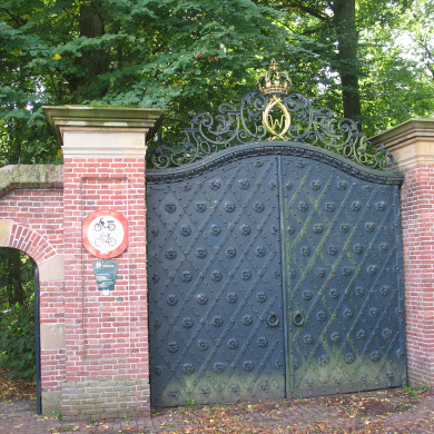 Toegangshek en tuinmuur ten noordoosten van het park, ter plaatse van de voormalige hoofdingang. In 1920 werd het oude spijlenhek vervangen door een hek naar ontwerp van architect H.A. Pothoven uit Amersfoort. De ingangspartij is een barokke stijl uitgevoerd; de dubbele gietijzeren deur heeft smeedijzeren versieringen in bandwerk en rozetten. Boven de ingang is een smeedijzeren en bekroonde W aangebracht. De in- en uitzwenkende tuinmuur is waarschijnlijk omstreeks 1800 gebouwd. De deuren zijn gevat tussen gemetselde pijlers die door een natuurstenen dekplaat worden afgedekt. Aan weerszijden van de pijlers bevindt zich een korfboogvormige doorgang, waarvan de rechter is dichtgemetseld.