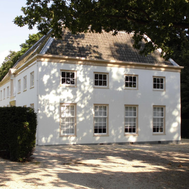 Aan de zuidzijde van het voorplein staand, in oorsprong vroeg-18de-eeuws bouwhuis waarvan de voorgevel op het noorden is gericht. Dit voormalige koetshuis (thans woonhuis) is een witgepleisterd, deels onderkelderd bakstenen gebouw op rechthoekige grondslag onder een met grijze pannen gedekt afgeknot schilddak. Om het gebouw een omgaande kroonlijst met geprofileerde gootlijst. De voorgevel heeft een grijs geschilderde plint en is in grote lijnen identiek aan de voorgevel van het noordelijke bouwhuis, zij het dat het 16-ruitsvenster boven de ingangspartij in dit bouwhuis een ongedeeld venster is en het linkervenster half dichtgezet en een 6-ruitsvenster is. In de rechterzijgevel beganegronds vier 15-ruitsschuifvensters en op de verdieping vier 6-ruitsuitzetvensters. De ongepleisterde linkerzijgevel heeft in het linkerdeel beganegronds een 25-ruitsschuifvenster met rechts een deur met 4-ruits bovenlicht, op de verdieping van dit deel twee gedeelde 18-ruitsuitzetvensters die boven de kroonlijst uitkomen. In het rechterdeel een 6-ruits kelderraam met diefijzers en een luik. In de achtergevel een tweedeling: links beganegronds drie 15-ruitsschuifvensters met rechts een door een lijst omgeven ingangspartij met een deur met enkel venster en 3-ruits bovenlicht. Op de verdieping vier 6-ruitsuitzetvensters. Het rechterdeel heeft twee 15-ruitsschuifvensters, een deur met 3-ruits bovenlicht en een 15-ruitsschuifvenster en op de verdieping vier 6-ruitsuitzetvensters. Op het dakschild drie dakkapellen door een fronton bekroond en voorzien van wangen. De buitenste dakkapellen hebben een gedeeld 12-ruitsuitzetvenster en de middelste heeft een 9-ruitsuitzetvenster.