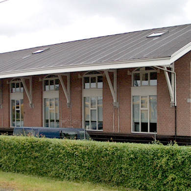 Uit één bouwlaag bestaande voormalige GOEDERENLOODS op rechthoekige plattegrond, onder een zadeldak met overstek aan alle zijden. Het zadeldak heeft aan zowel de linker- (Z) als de rechterzijde (N) een ruime overstek, gedragen door een uit zes houten spanten bestaande constructie. De spanten hebben ijzeren moeren en worden elk geschraagd door een natuurstenen console.