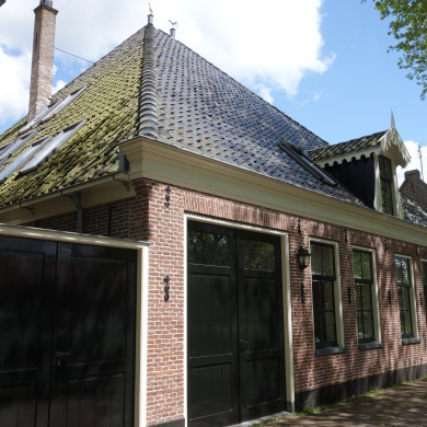 De linkerzijde (N) heeft ter rechterzijde een origineel houten schuifvenster met zesruitsroedenverdeling.