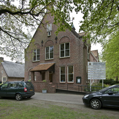 Gemeentehuis gebouwd in 1939 naar ontwerp van A. Baart (Leeuwarden) in de stijl van de Delftse School. Uit een brief van 23 maart 1938 (archief gemeente Dwingeloo) blijkt dat aanvankelijk gedacht werd aan een plek nabij de kerk, later komt nog een terrein aan de huidige Entingheweg in beeld maar de uiteindelijke keuze viel op 'een ruim terrein gelegen aan een der zijden van de Brink'. In de gang van het gemeentehuis een stichtingssteen: 11 juli 1939 werd de eerste steen gelegd door mevr D.M.E.A.J. Stork van der Kuyl. Burgemeester: W.A. Stork, weth E.J. Bloemerts, secretaris H. Henkel en weth J. Dekker. Als bijzonderheden kunnen nog worden genoemd: