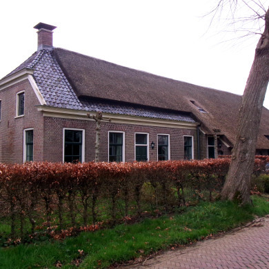 Vroeg 19e eeuwse boerderij met zijbaander en langgerekt, rieten dak. In de voorgevel van het woonhuis vensters met zesruitsschuiframen.