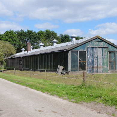 INTERIEUR: de schuur is opgebouwd uit een repeterende constructie van houten spanten die op stijlen zijn geplaatst. Plafond bekleed met (deels nog) bepleisterde rietmatten; het overige gedeelte, boven de tweede spantbalk, is voorzien van draadglas-panelen; hierin zijn ook ventilatieluiken opgenomen. Het gemetselde stookhuis heeft een diepliggende vloer waarop de oorspronkelijke kolengestookte gietijzeren kachel staat. Van hieruit lopen langs alle gevels dikke verwarmingsbuizen op vloer- en muurplaat-niveau.
