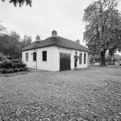 DIENSTGEBOUW (personeelswoning) met zuilenportico, gerealiseerd in 1832 naar ontwerp van de Amsterdamse architect Israël Warnsinck en oorspronkelijk bestemd tot woning voor de doodgraver annex bergplaats voor baren en gereedschappen e.d. Vier traveeën breed en drie traveeën diep deels onderkelderd gebouw op rechthoekige plattegrond, gedeeltelijk op natuurstenen plint opgetrokken uit witgepleisterde baksteen en gedekt door een samengesteld rieten schilddak met (vernieuwde) hoekschoorstenen; het overstekende voorschild rust op vijf houten kolommen met eenvoudig geprofileerde basementen en kapitelen; verkropte kroonlijst. In de voorgevel halfrondgesloten vensters met vierruitsverdeling onder en V-vormige indeling boven de tussendorpel. In de linker- respectievelijk rechterzijgevel dito vensters, een opgeklampte toegangsdeur met halfrond bovenlicht met V-vormige indeling en dubbele opgeklampte deuren onder zware geprofileerde lijst; de indeling der overige gevels (deur en rechtgesloten meerruitsvensters), is niet meer geheel oorspronkelijk. Het INTERIEUR van de woning is aan moderne eisen aangepast en is voor de bescherming van ondergeschikt belang.