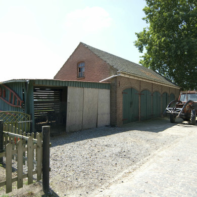 Wagenschuur, één bouwlaag hoog met zadeldak gedekt met gesmoorde groefpannen, opgetrokken in roodbruine baksteen.