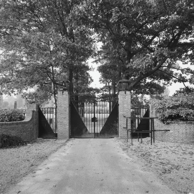 Het TOEGANGSHEK bestaat uit twee hoge rode bakstenen pijlers op een vierkante plattegrond, met smallere toppen waarop smeedijzeren lantaarns onder tentdakjes. Aan weerszijden van de hoge pijlers staan lage rode bakstenen pijlers op een vierkante plattegrond. Tussen de vier pijlers hangen smeedijzeren deuren met spijlen en aan één zijde afgeschuinde platen.