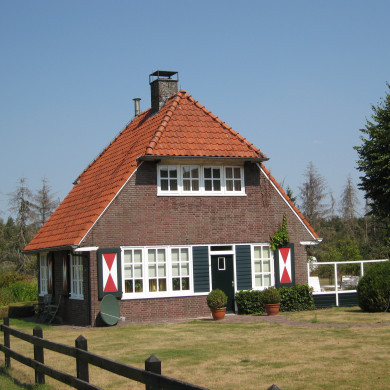 Eenvoudige DIENSTWONING opgetrokken in roodbruine baksteen over één bouwlaag op een rechthoekige (nagenoeg vierkante) plattegrond onder een met rode Hollandse pannen gedekt wolfdak. Het oostelijke dakvlak is verlengd boven een kleine uitbouw aan de noordoostkant. De voorgevel met de hoofdingang, tussen horizontale beschotten, ligt naar de boerderij gekeerd (Z). In de achtergevel is een deur tussen twee smalle vensters geplaatst. Daarnaast worden de gevels nog geleed door zes- en vierruits vensters en luiken met wit-rode zandlopers en een groene rand.