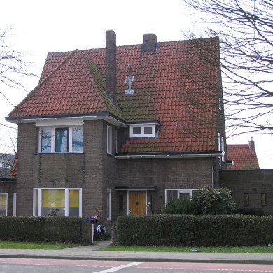 Het trappenhuis is aan de achtergevel zichtbaar als een iets uitgebouwde gevelpartij met een fors glas-in-lood raam. Overigens bezit de woning sobere of vereenvoudigde ramen. De gevels worden afgesloten door een ver overstekende dakvoet met goot welke aan de onderzijde als cassettenplafond is vormgegeven. Het schilddak is gedekt met rode verbeterde hollandse pannen en bezit in de entree-as een kleine dakkapel.